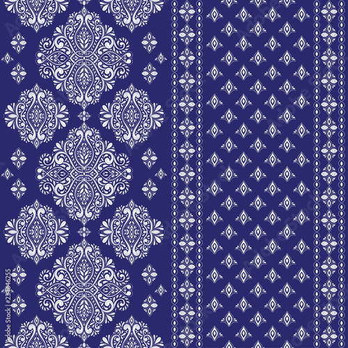 Gorgeous seamless pattern from blue and white floral turkish, moroccan, portuguese azulejo tiles and border, ornaments.
